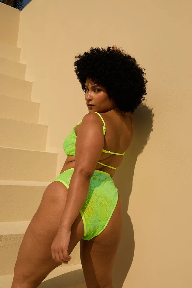 Capture la lumière des étoiles. Ce top jaune néon à sequins, issu de la collection Future Nostalgia de Rolling, est une ode à la sensualité nocturne. Son décolleté arrondi classique contraste avec un dos minimaliste à doubles bretelles réglables, pour un ajustement parfait. Brille de mille feux et révèle ton éclat — celui d’une véritable galaxie.